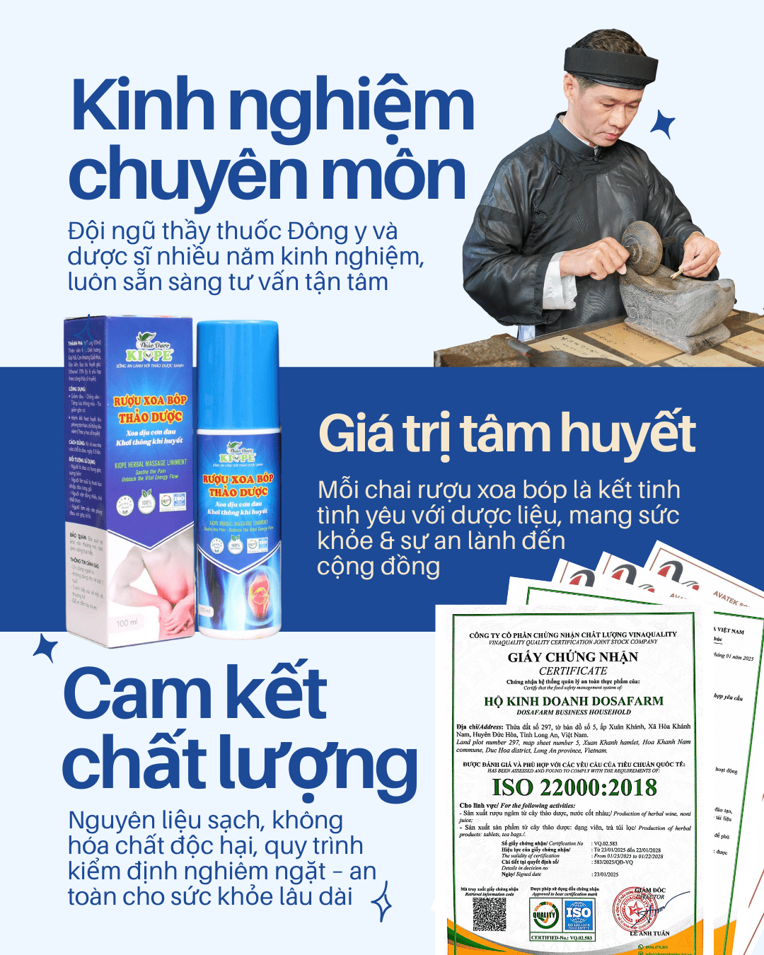 Rượu xoa bóp KIOPE là sản phẩm đặc chế từ các vị thuốc quý theo công thức cổ truyền, kết hợp cùng công nghệ ngâm ủ hiện đại tại Farm dược liệu sạch DOSA, mang lại hiệu quả cao trong hỗ trợ giảm đau, giảm viêm, thư giãn gân cơ và lưu thông khí huyết.